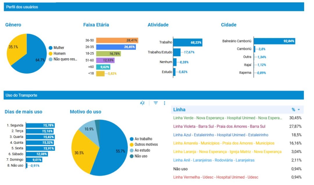 Uma pesquisa feita com usuários do transporte coletivo gratuito de Balneário Camboriú mostrou que a maioria dos passageiros é formada por mulheres que usam o serviço para trabalhar ou estudar. A linha mais utilizada é a Linha Verde (Nova Esperança - Hospital Unimed), e a avaliação geral do serviço é bastante positiva — com elogios aos motoristas e à limpeza dos veículos.